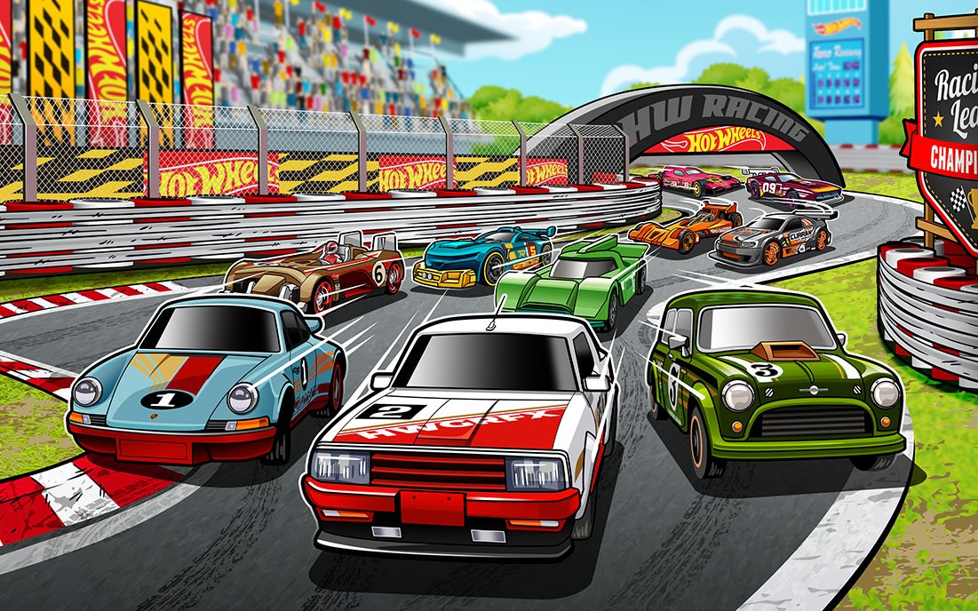 Early sketches and concept layouts established the tone for the series—bold, fast, and full of personality. Each illustration balanced ten unique cars in a compact space, creating a dynamic track environment packed with motion and excitement.