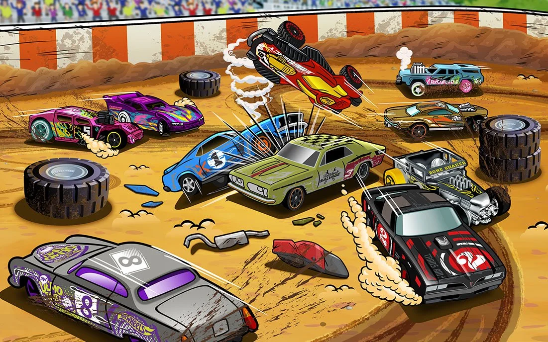 This series captures the grit and mayhem of figure-8 racing: collisions, near-misses, tire stacks, flying debris, and dust clouds everywhere. Balancing ten cars in constant motion meant shaping a scene that feels messy in all the right ways: readable, fun, and packed with storytelling beats that reward kids who study every corner.