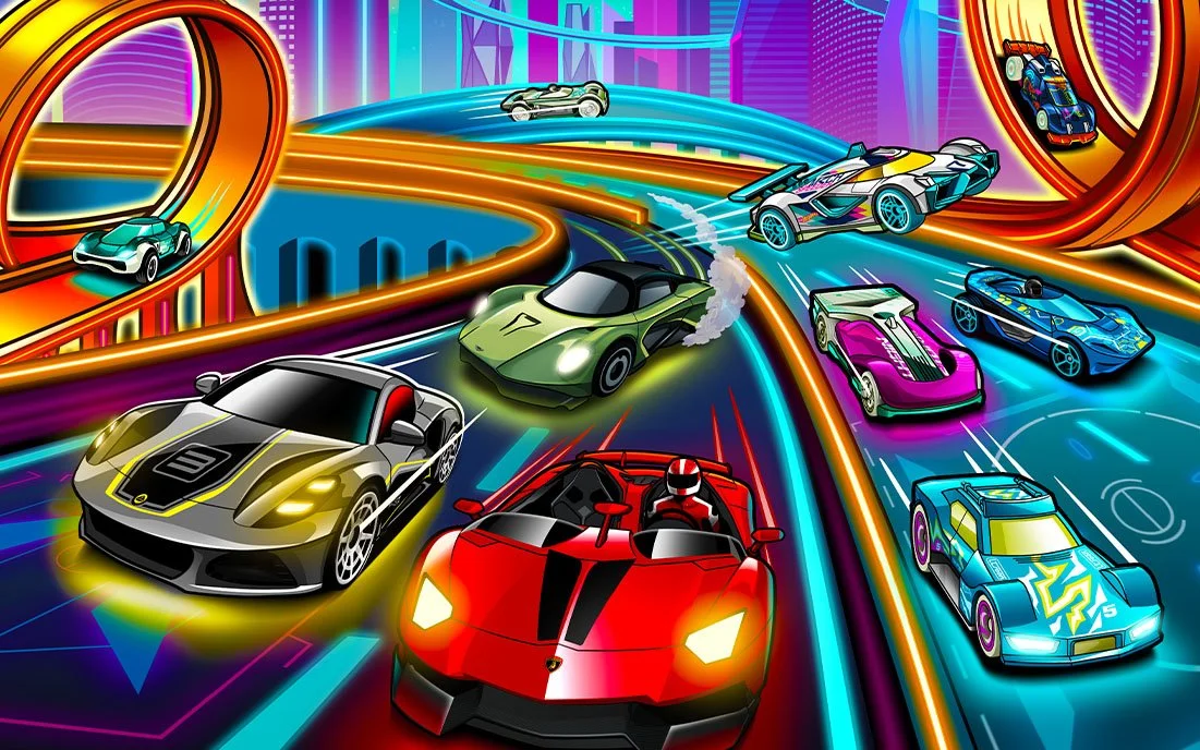 With elevated tracks, glowing architecture, and sleek new vehicle styles, this scene brought high-speed chaos into a vertical world. The challenge was creating a dense environment that kept the action clear and every car readable—resulting in a polished illustration ready for packaging, retail displays, and marketing.